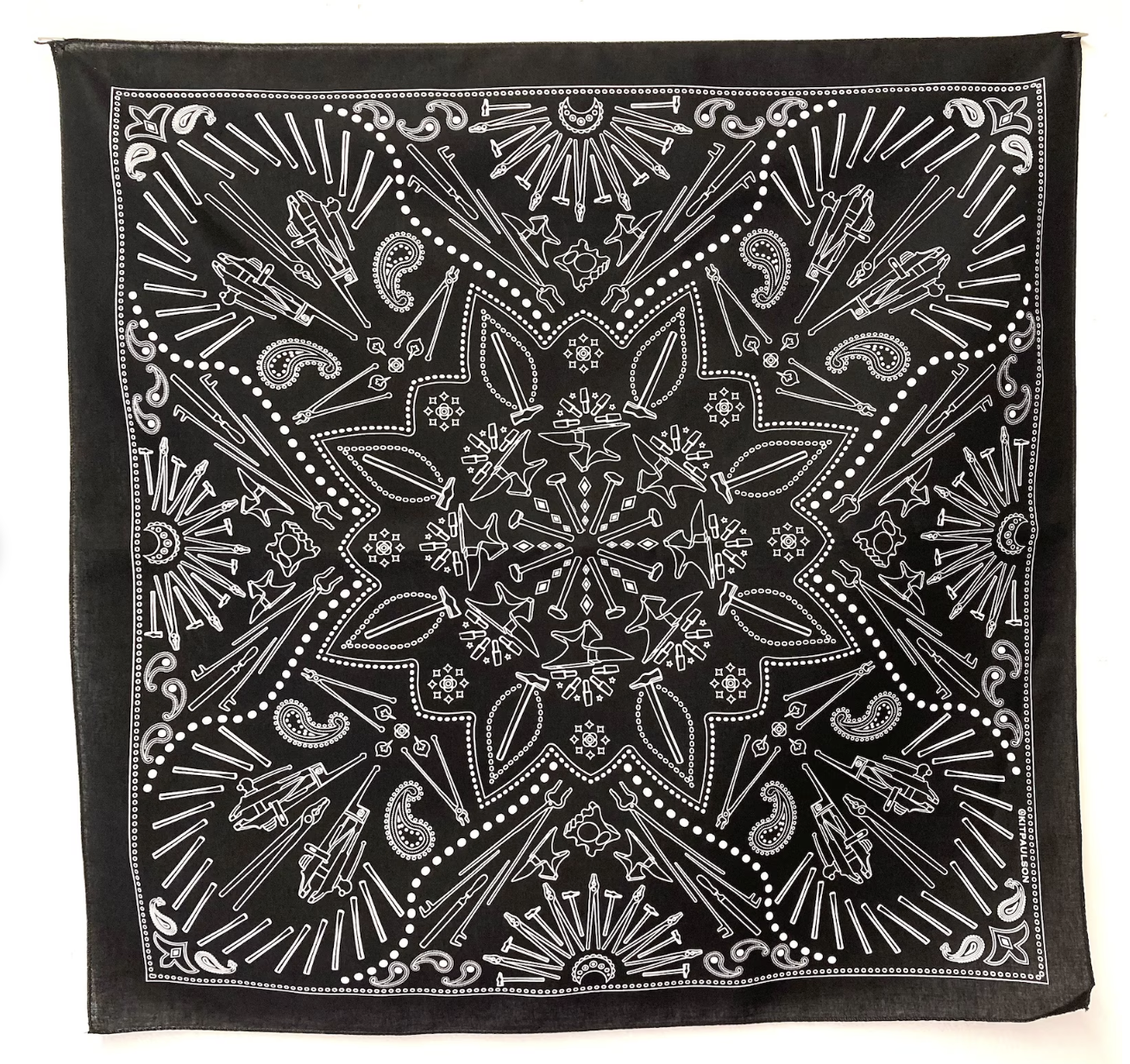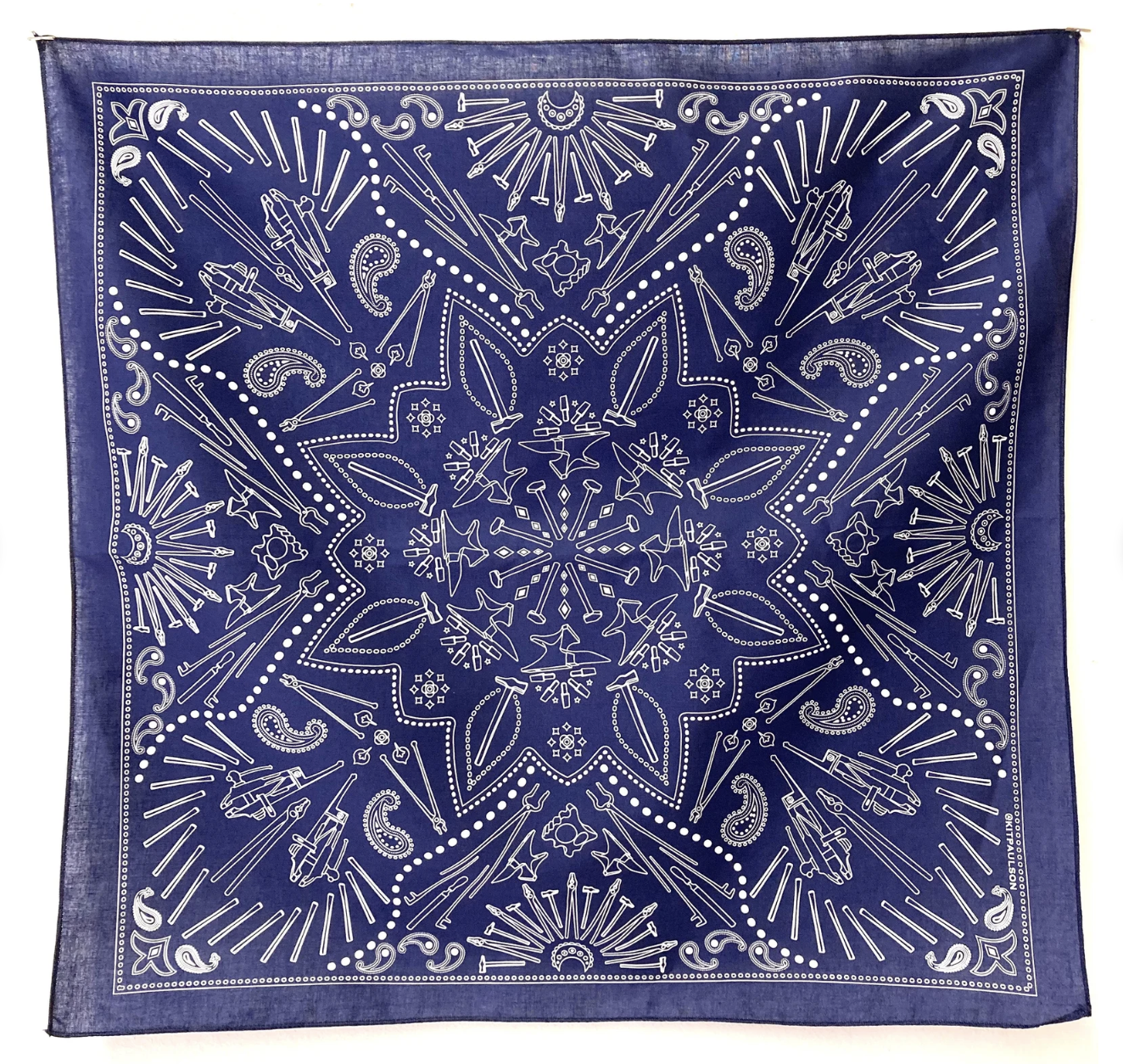 It’s a bandana with patterns made up of tiny blacksmith tools! Hammers, tongs, anvils, vices, they’re all on there!