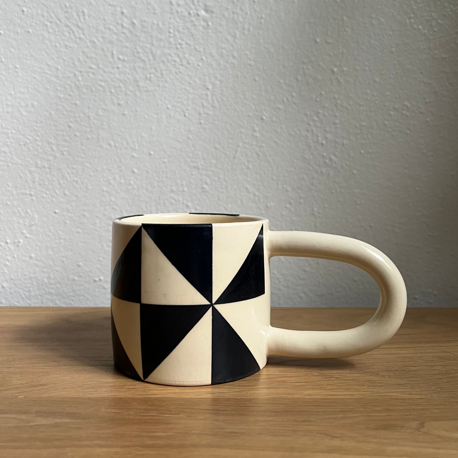 Wheel-thrown and hand-painted stoneware mug by Asheville maker KNOOK Ceramics. Finished with a semi-matte clear glaze. Primary colors, but shape color and placement vary from cup to cup.