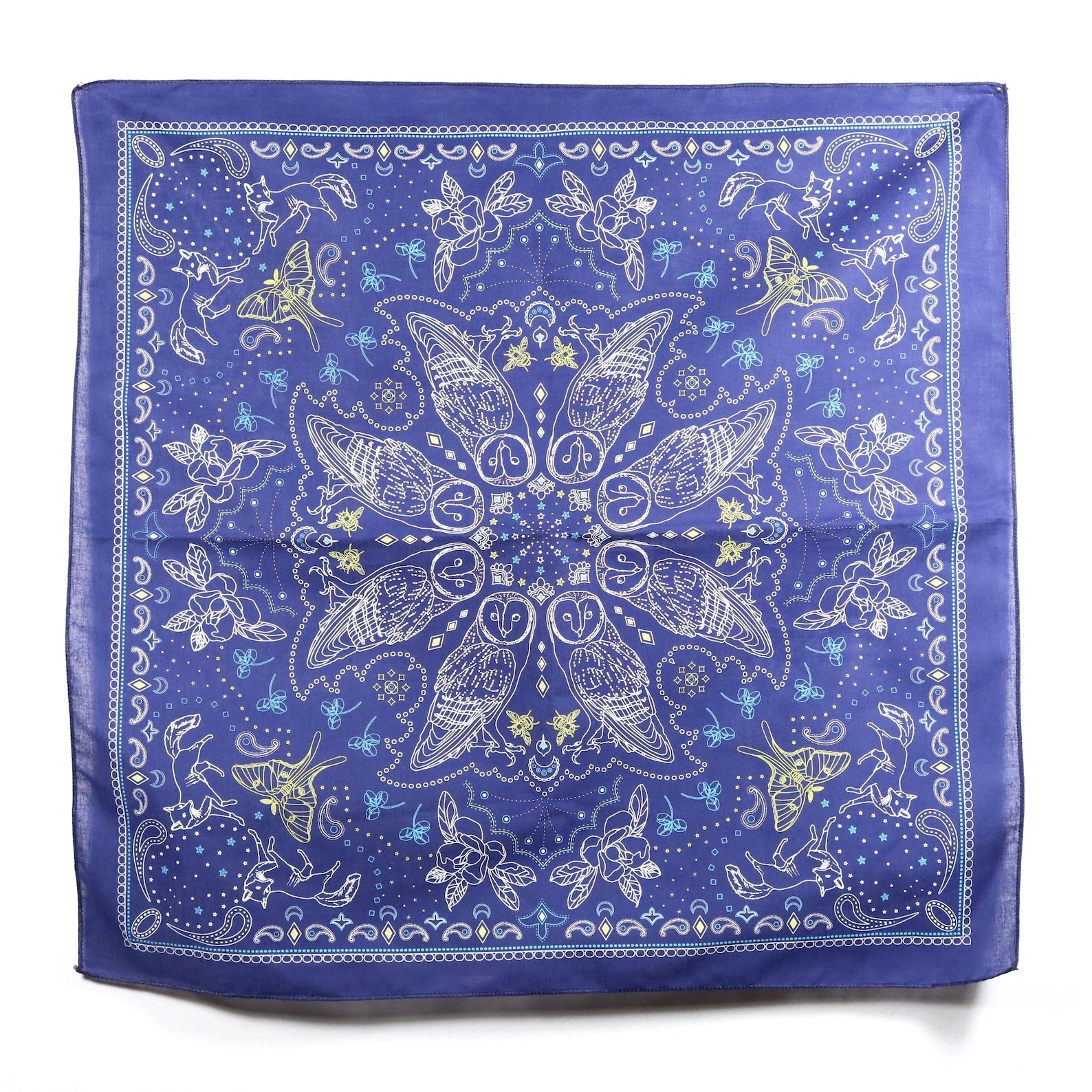 Printed in three colors, this bandana features owls, magnolia flowers, luna moths, foxes, bees and clover.