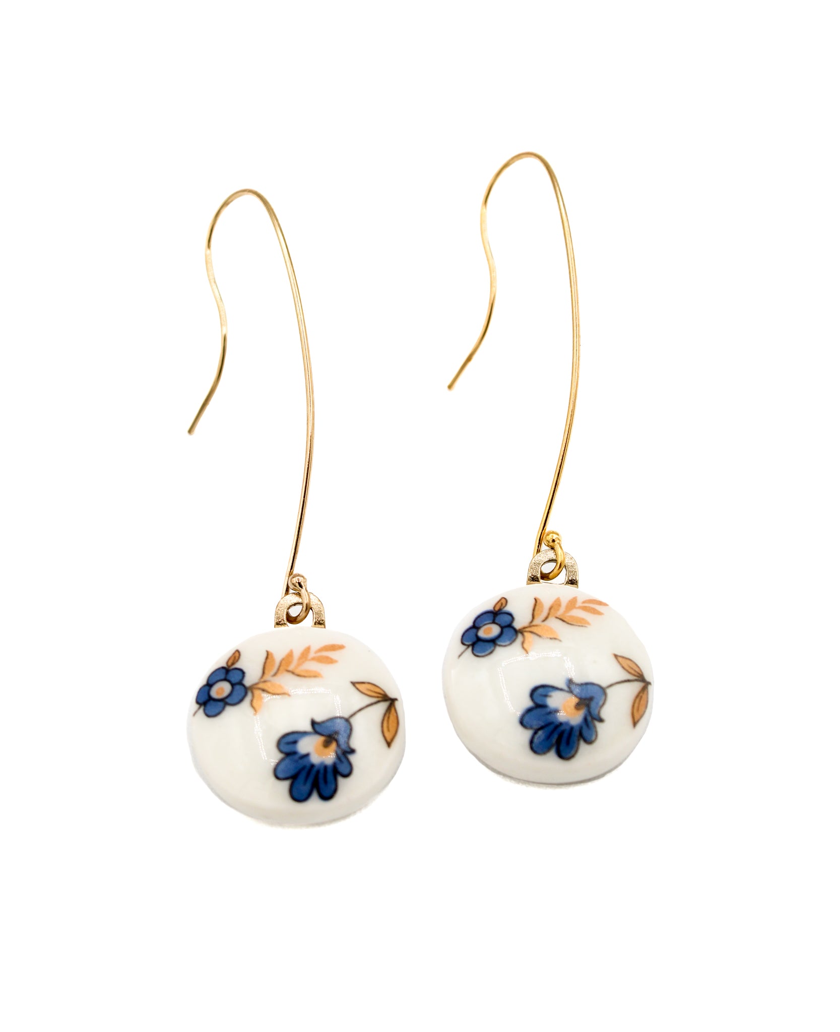 Porcelain Dangle, Round, Blue & Gold Vintage Flowers,14k Gold-Filled Round Wire